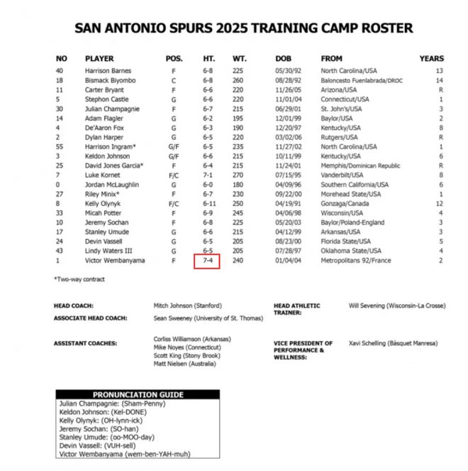 真长个了!NBA和马刺官方都将文班亚马身高更新为2米26